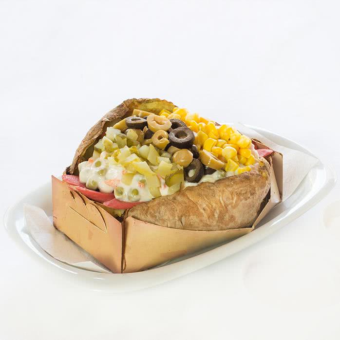 Frisch gebackene große Ofenkartoffel geöffnet & mit Butter und Käse vermengt